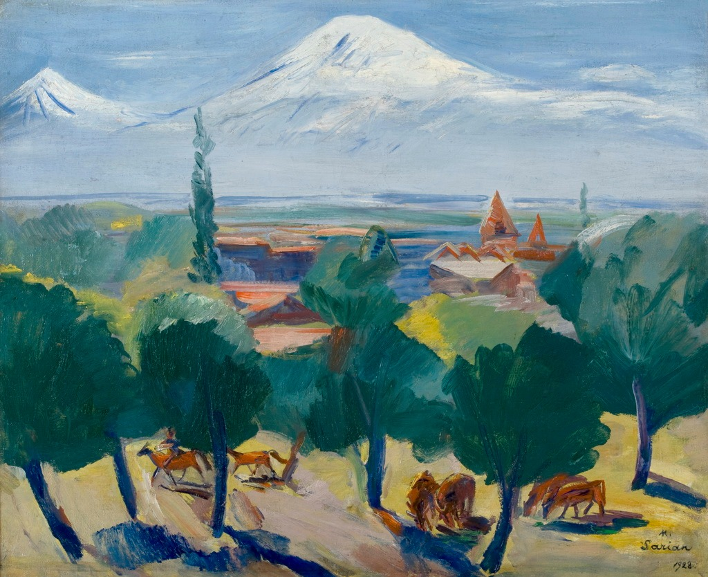 Библейский Арарат, словно, купол, возвышается над городом, во всей своей мощи и величии. С его формой словно перекликаются большой и малый купола церкви Зоравор. Природа Армении высекла горы, а человек повторил их формы в архитектуре церквей, олицетворяющих веру, молитву и преклонение перед Богом. Живописный строй картины проникнут присущей Сарьяну верой в торжество солнечного света. Хоть день и мглистый, а Арарат подернут легкой дымкой, передний план картины с деревьями и пасущимися под ними лошадьми освещен солнцем.
